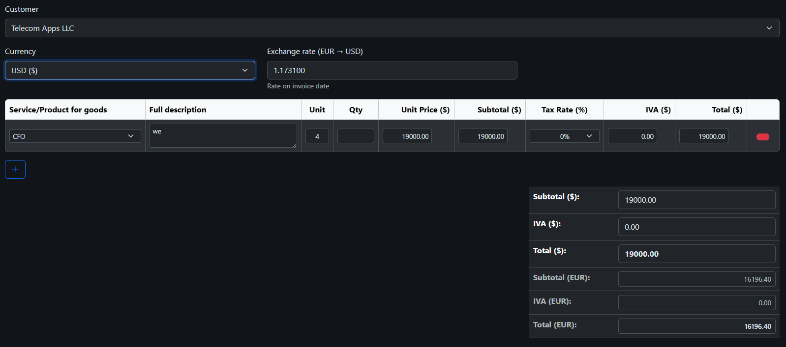 Invoices may be issued in foreign currency. However, accounting records and VAT declarations must reflect the EUR equivalent using the official exchange rate on the invoice date.