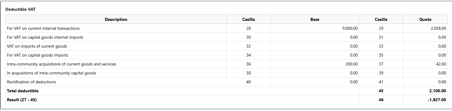 The transaction is automatically allocated to boxes 28 and 29 of Modelo 303. For VAT on current internal transactions