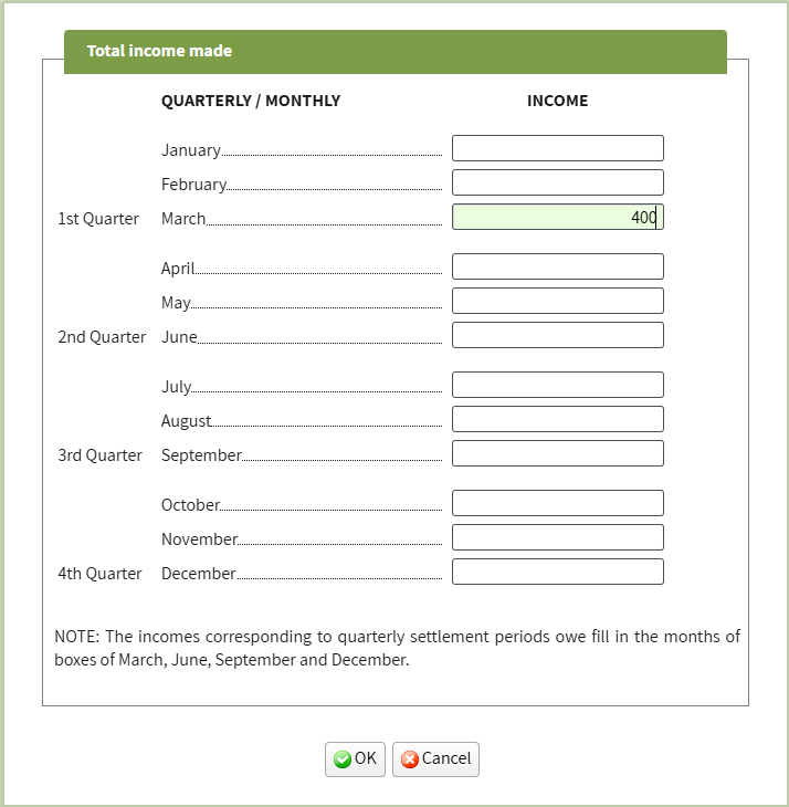 - If there was a payment in the quarterly declarations (modelo 303), for example, 400 euros for the first quarter, we will indicate the amount. The amount is reported in the last month of the quarter.