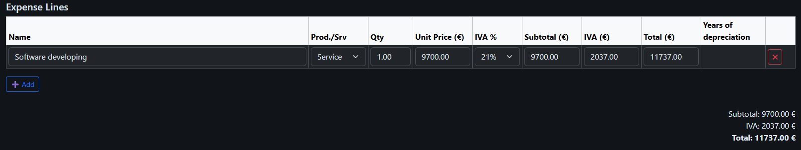 In total, we invoiced €24,710. Of this amount, IVA accounted for €210.