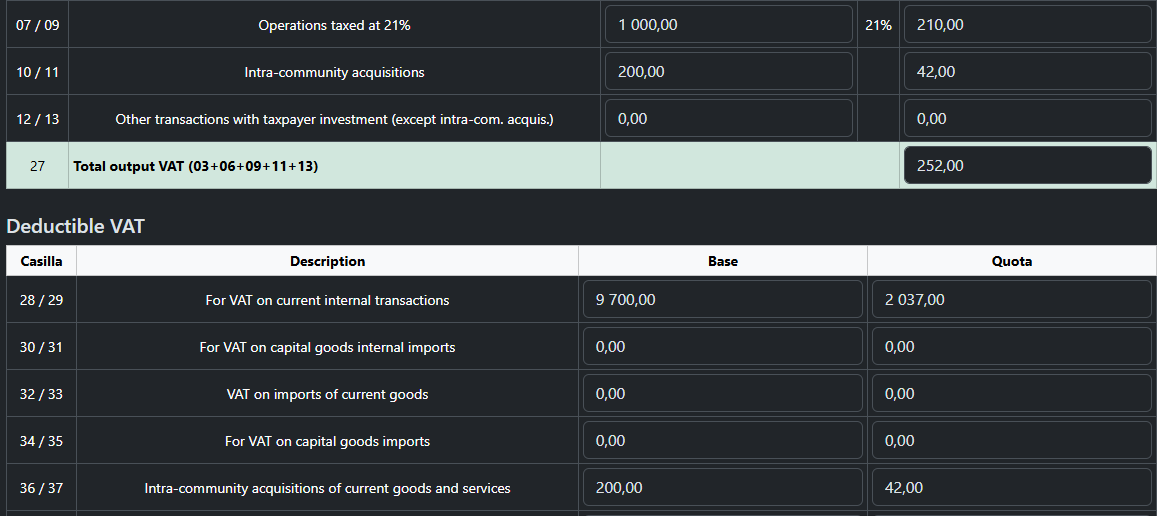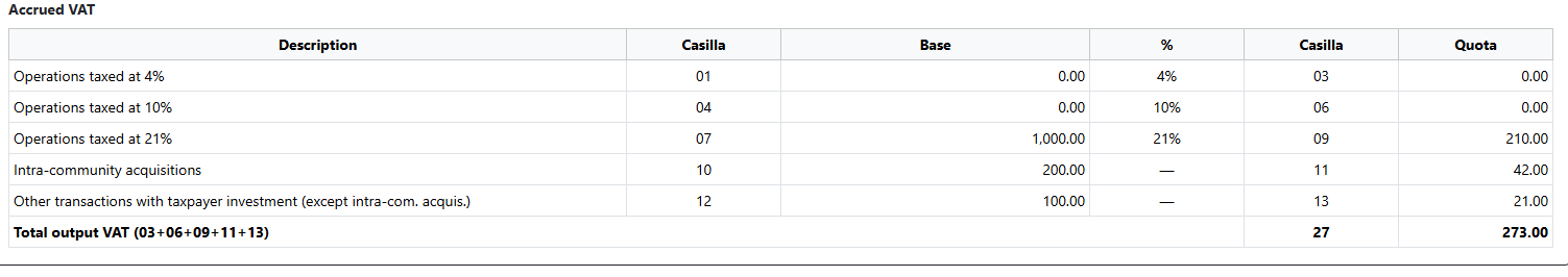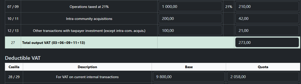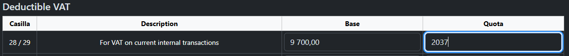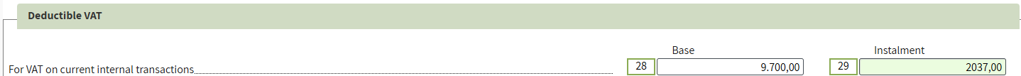 The transaction is automatically allocated to boxes 28 and 29 of Modelo 303. For VAT on current internal transactions