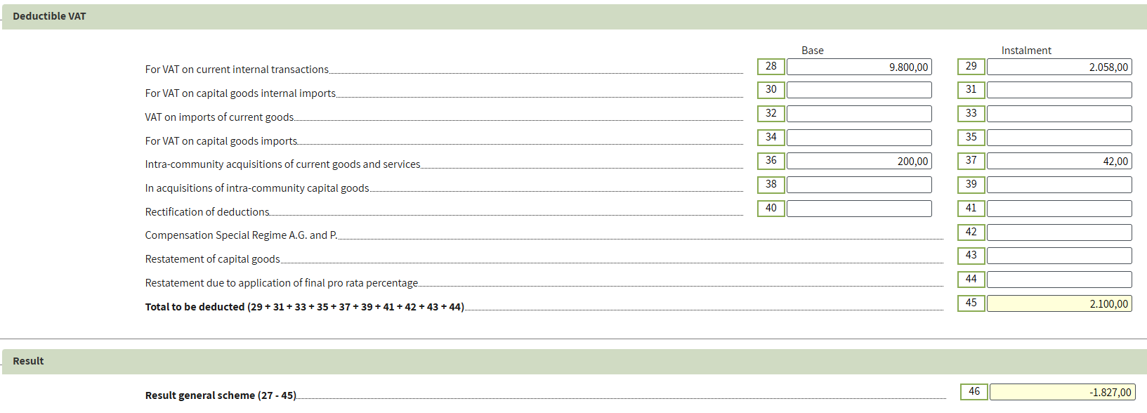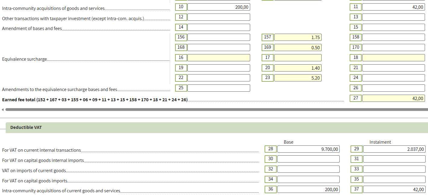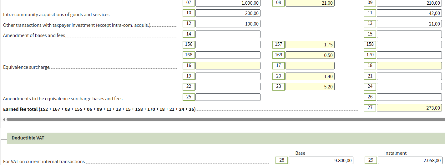 On this amount, you must self-account for VAT at 21% (€21) and claim it as deductible. In the declaration, this operation will be reflected in the following lines: Taxable: 12/13 – Other transactions with taxpayer investment (except intra-community acquisitions); Deductible: 28/29 – VAT on current domestic transactions.