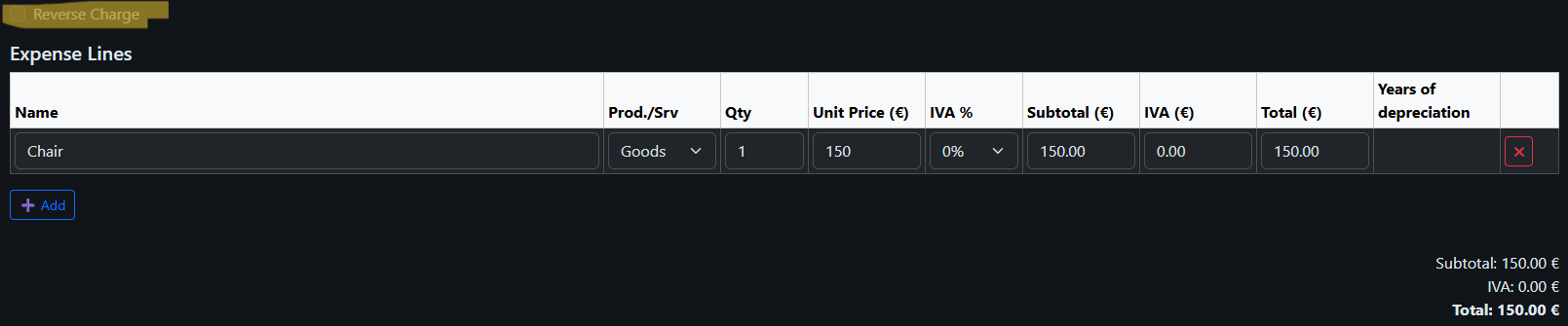 For example, if you purchase a chair from a supplier not registered in the ROI (Italy) for €150, no Italian VAT (22%) is applied; the full amount is recorded as an expense. The same procedure applies for other suppliers from different regions and for invoices without Reverse Charge.