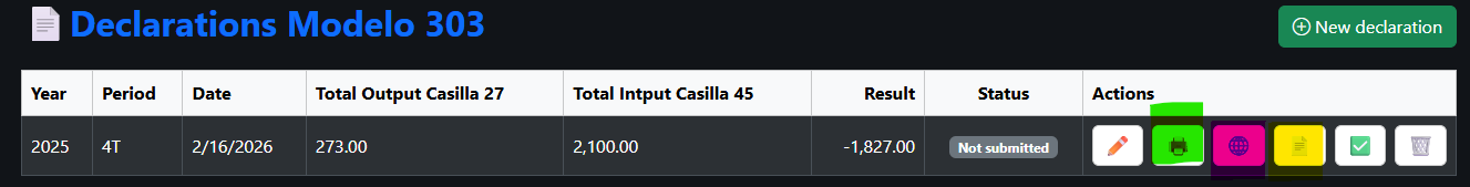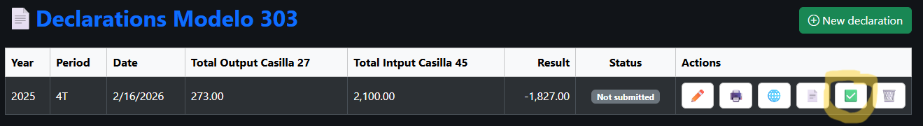 Final summary of Modelo 303: Unlike Modelo 130, Modelo 303 is not filed on a cumulative basis. VAT is calculated as the difference between Accrued VAT (output VAT) and Deductible VAT (input VAT). If the result is positive, the amount must be paid. If the result is negative, it is carried forward to subsequent periods or may be refunded, at your discretion, in the fourth quarter. Accurate bookkeeping in the Income and Expense Ledgers ensures the correct completion of the declaration.