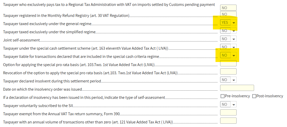 On the first page, select NO in the field Taxpayer liable for transactions declared that are included in the special cash criteria regime; other fields will be filled automatically. If not, verify as shown in the image.