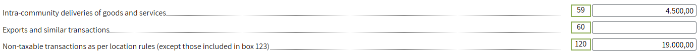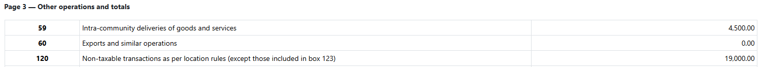The amount of the invoice issued to the USA client (€19,000) is included in box 120 Non - taxable transactions as per location rules(except those included in box 123).