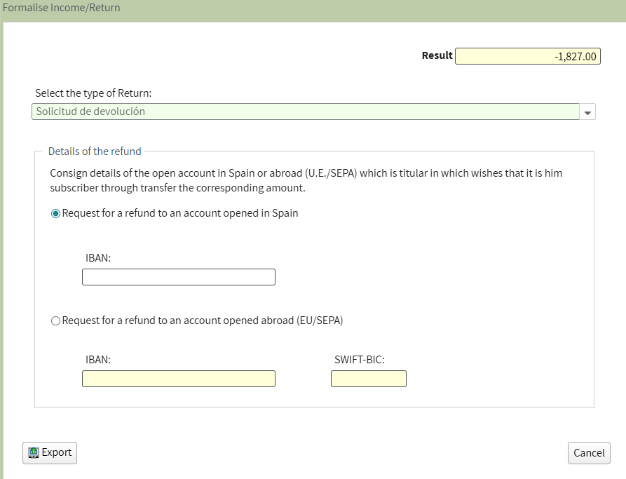You may request a refund to your bank account by selecting Solicitud de devolución and providing your bank details.