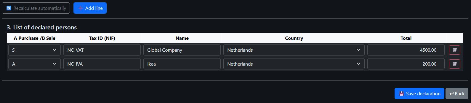 Select the reporting period and click Recalculate. The declaration will be filled automatically.