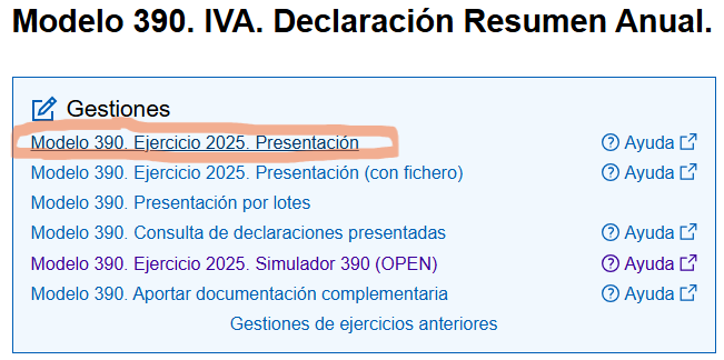 Modelo 390 is the annual VAT (IVA) summary declaration required by the Spanish Tax Agency (Agencia Tributaria). It consolidates all quarterly or monthly VAT returns filed through Modelo 303.